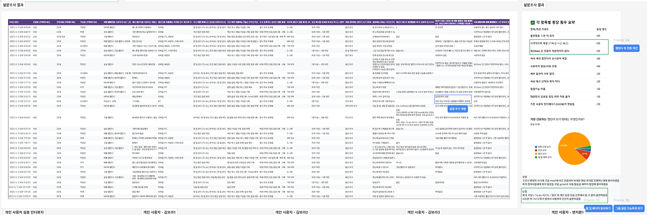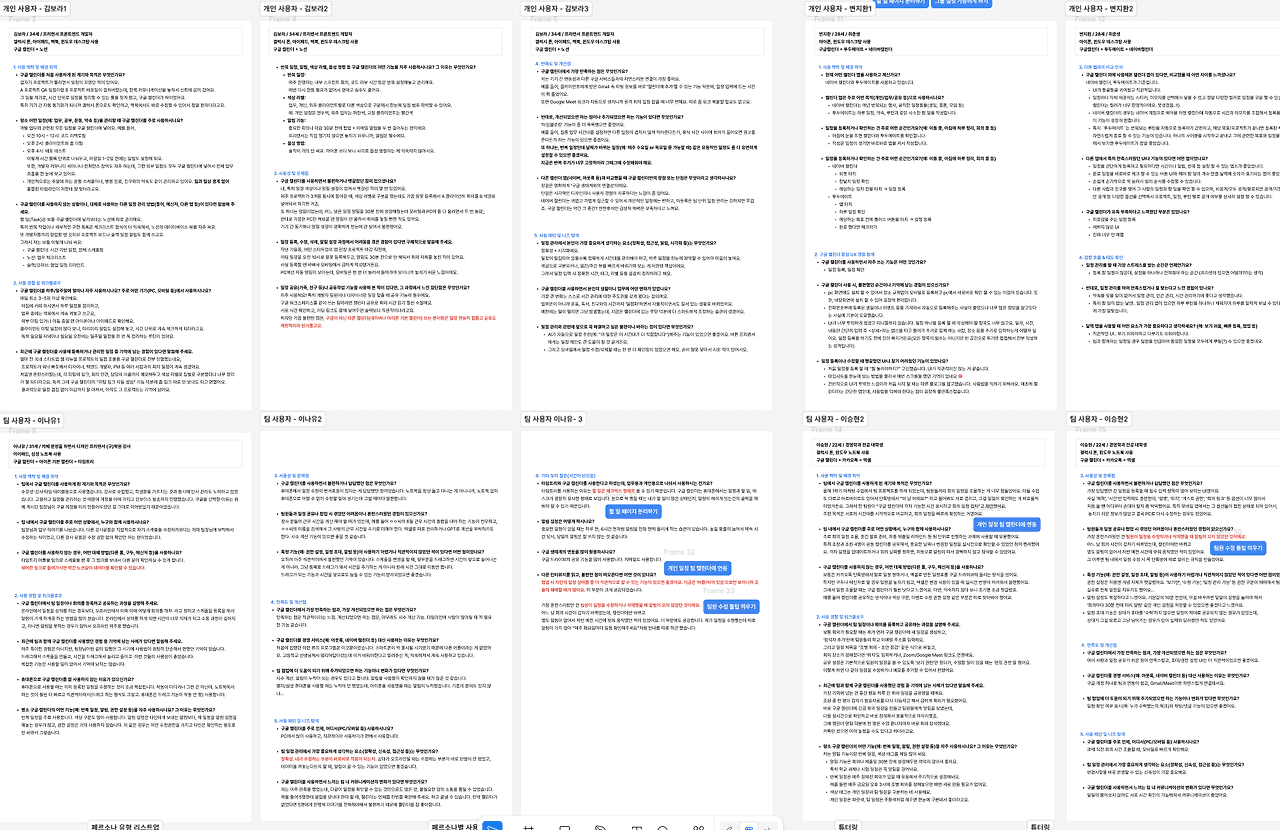 인터뷰도 진행했다. 정량적인 조사에 비해 정성적인 조사가 더 깊숙한 이야기를 할 수 있어서, 이쪽에서 인사이트를 더 많이 찾은 것 같다. (파란색 라벨이 인사이트가 나온 곳이다) 한 분은 줌으로 인터뷰를 진행했는데, 온라인 상으로 인터뷰 요청을 해본 건 처음이라 신기하고 재미 있었다. "할 일이 정말 많아서 하루에 10건이 넘는 to do가 생기기도 하는데요, 캘린더와 todo가 합쳐지면.. 한 화면에 너무 많은 일정과 정보가 쏟아질 것 같아요" 라는 말을 언급해주셔서 주요 인사이트로 삼았다. 팀 사용 시, 일정을 수정했을 때 팀원에게 알림이 가지 않는다는 것과 개인 일정이 팀 캘린더에 올라올 때의 불편도 새로 알게 되었다.
