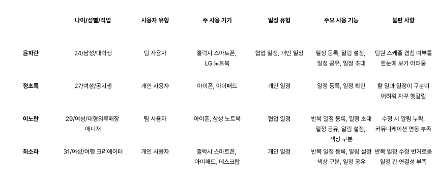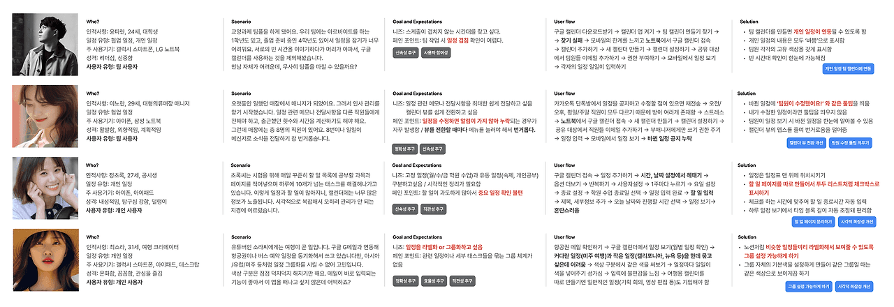 설문조사와 인터뷰를 바탕으로 페르소나를 만들어 보았다. 되도록 많은 사용자를 포용할 수 있도록, 개인 사용자/팀 사용자를 각 2명씩으로 설정하고 주로 사용하는 기기와 일정 유형도 다르게 설정했다. 불편 사항을 적으면서 페르소나에 공감할 수 있어서 재미 있었다. 이 구간은 생각보다 빠르게 진행이 됐던 것 같다.