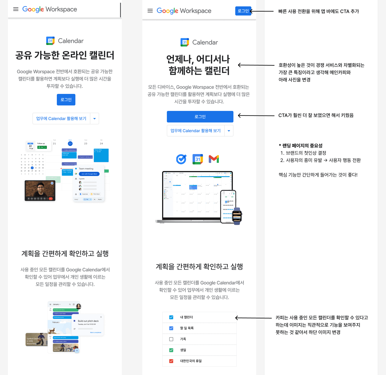 랜딩 페이지 수정도 과제의 일부라서, 약간의 시간을 들여 내용을 고쳐보았다. 적혀 있는 것처럼 빠른 사용 전환을 위해 앱 바에도 CTA를 추가했고, 호환성이 높은 것이 경쟁 서비스와 차별화되는 가장 큰 특징이라고 생각해 메인카피와 아래 사진을 변경했다. 다음 섹션에서는 '사용 중인 모든 캘린더를 확인할 수 있다'고 하는데 이미지는 직관적으로 기능을 보여주지 못하는 것 같아서 하단 이미지를 변경했다.