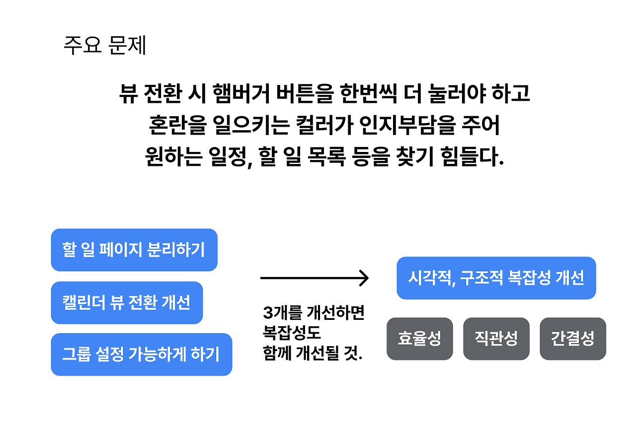 이 부분은 내가 수정한 UI인데, 뷰 전환 변화와 할 일 목록 추가, 할 일과 일정 추가를 간소화한 것이 특징이다. 이렇게 모아놓고 보니 별 거 아닌 개선 같지만 나름 힘들었다(특: 아무도 뭐라고 안 했음) 그래도 깔끔하게 정리하니까 보기 좋아서 기뻤다.