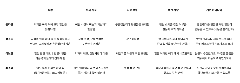 각 페르소나가 겪는 상황, 문제 지점, 사용 행동, 불편 사항, 개선 아이디어를 정리했다. 페르소나의 특성과 상황에 따라 각각 다른 솔루션을 줄 수 있어서 흥미로웠다.