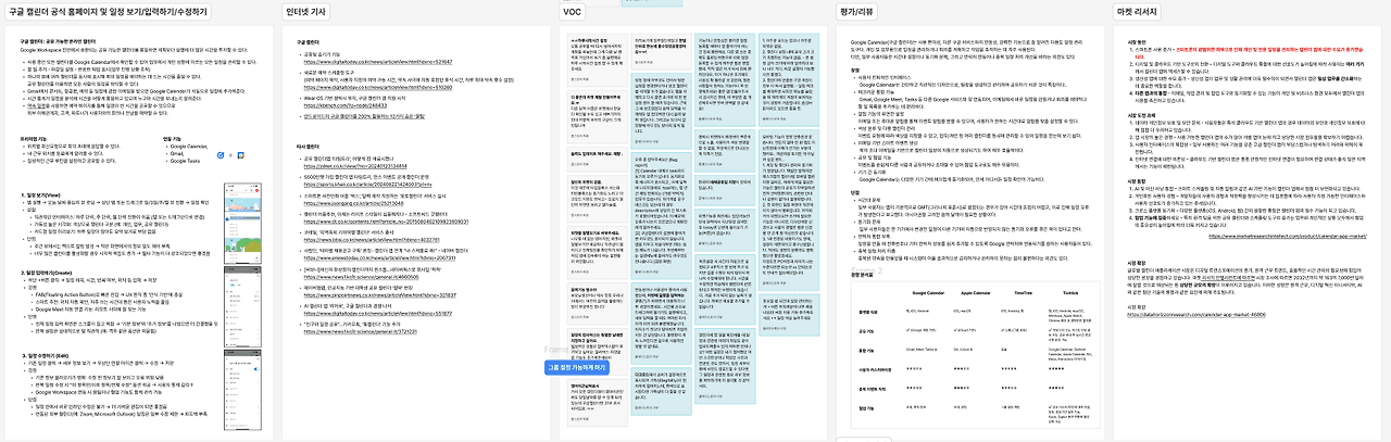 이번 과제는 구글 캘린더 UX 리서치 및 개선이었다. 캘린더는 매일 사용하는 기본 도구이지만, 실제로는 구글 캘린더의 다양한 기능을 매우 제한적인 사용자들만 쓰고 있었다. 먼저 데스크 리서치를 했다. 시장 조사도 하고 타 서비스와 비교도 해보고, 각 메뉴의 기능을 분석해보기도 했다.