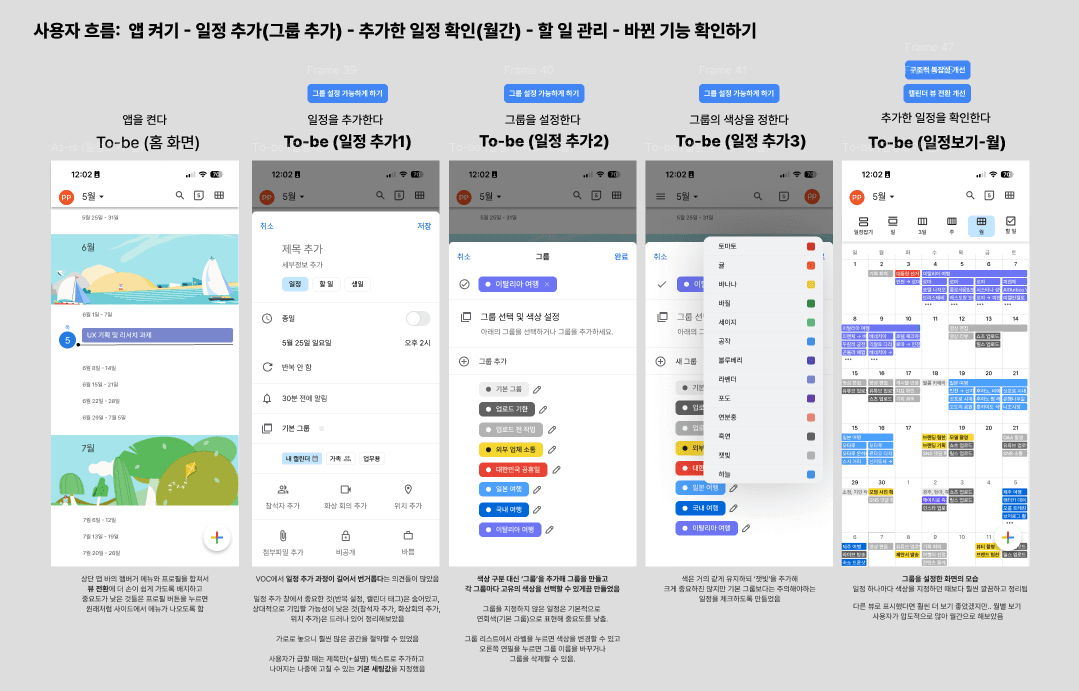 일정 추가 2는 '그룹 선택'인데 색상 구분 대신 [그룹]을 추가해 그룹을 만들고 각 그룹마다 고유의 색상을 선택할 수 있게끔 만들었다. 그룹을 지정하지 않은 일정은 기본적으로 연회색(기본 그룹)으로 표현해 중요도를 낮췄다.
