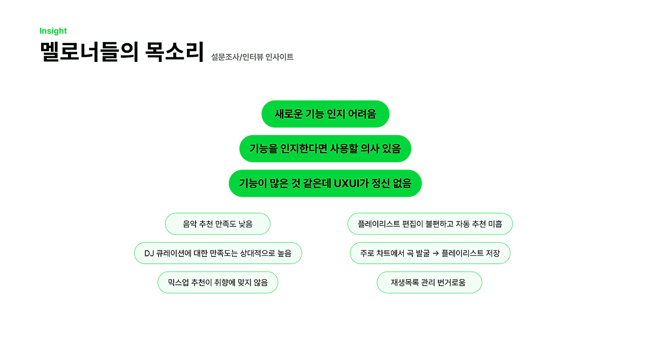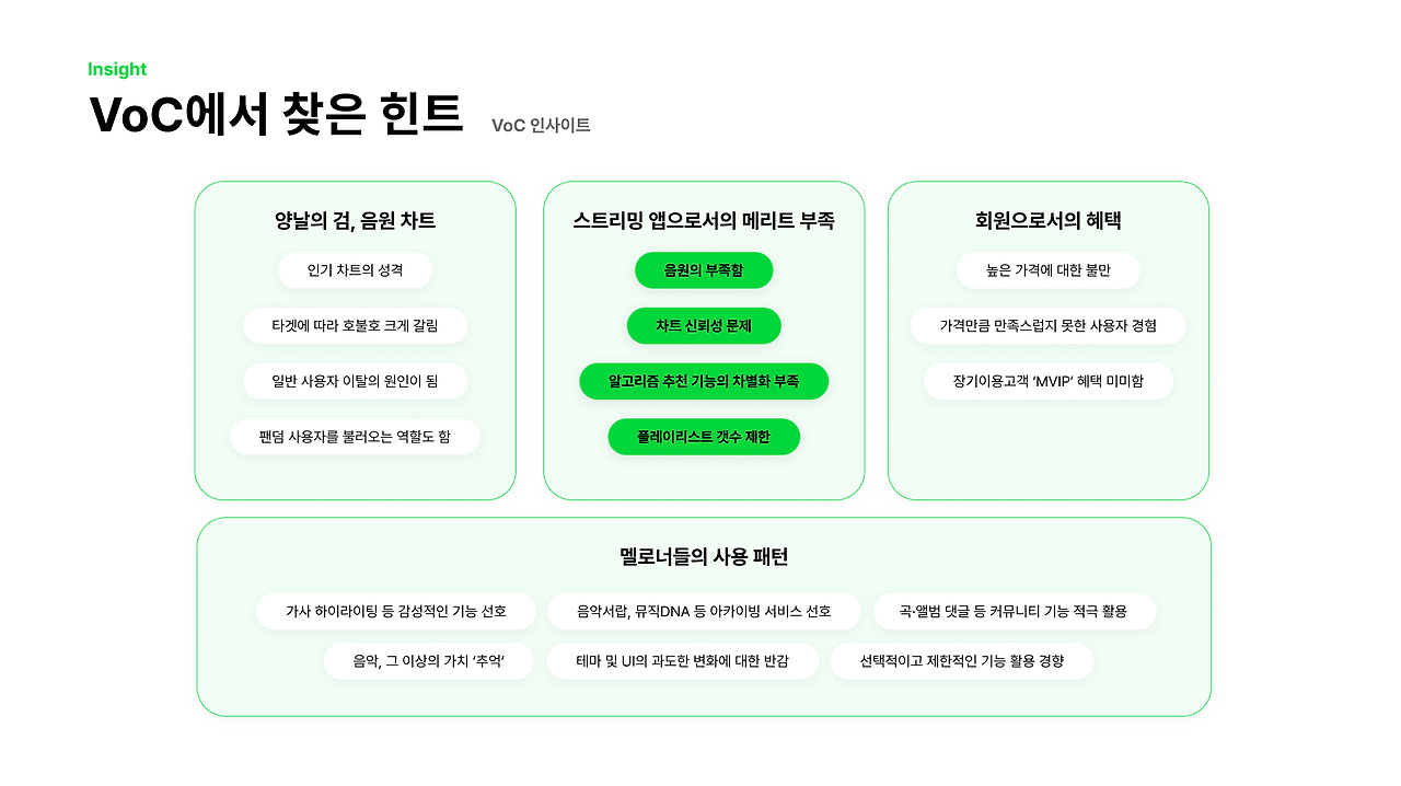 하지만 우리는 실제 사용자의 목소리인 VoC를 통해, 멜론이 음악 스트리밍 앱으로서의 핵심 가치가 여전히 부족하다는 점에 주목하게 되었다.