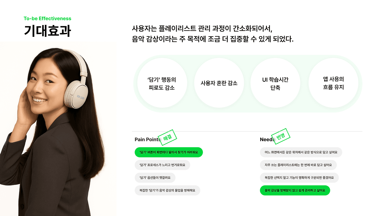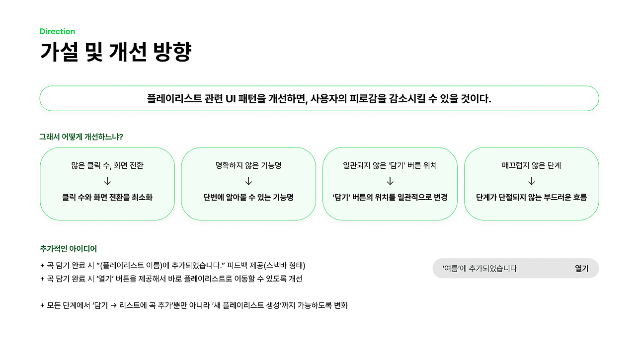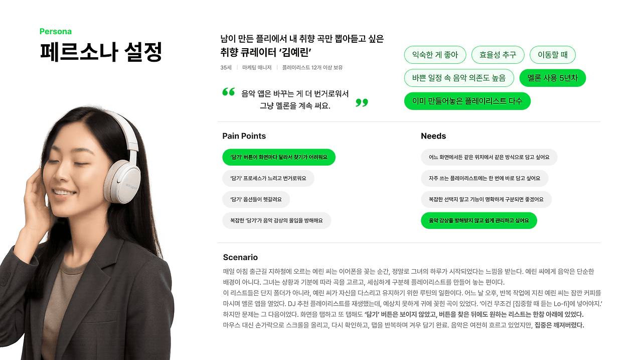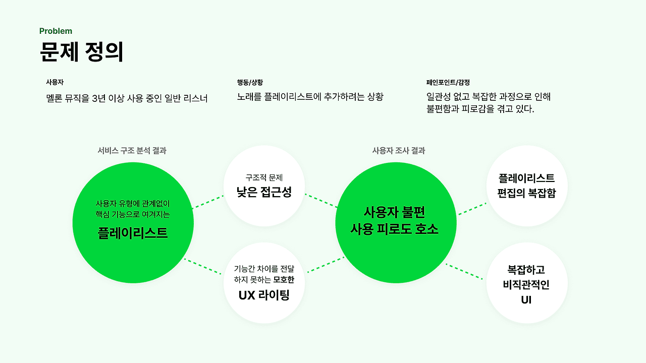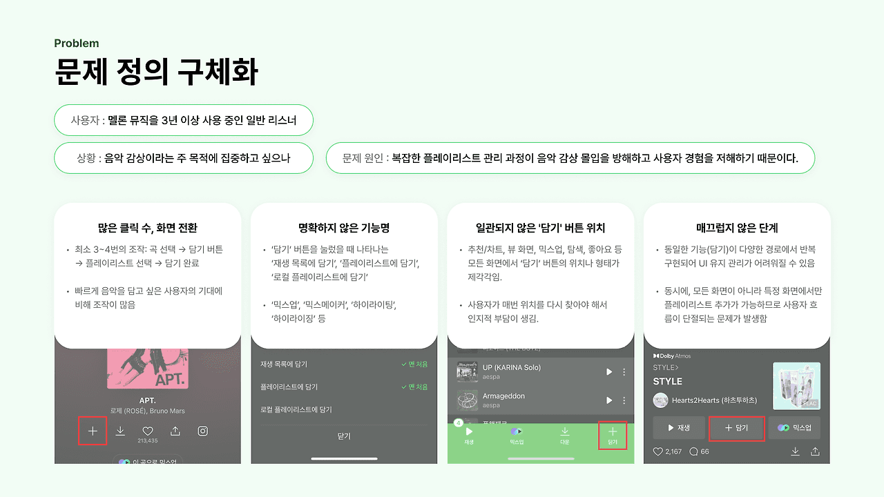 “멜론을 3년 이상 사용한 일반 리스너가 / 노래를 플레이리스트에 추가하려는 상황에서, / 일관성 없는 복잡한 과정으로 인해 불편함과 피로감을 겪고 있다.”