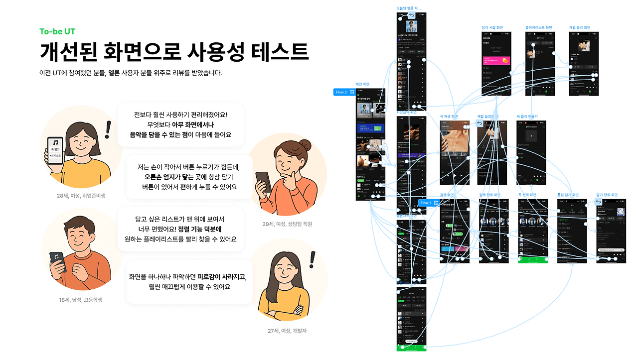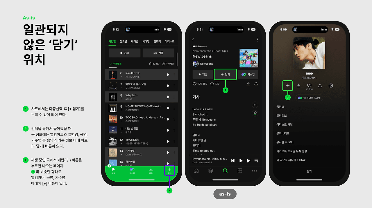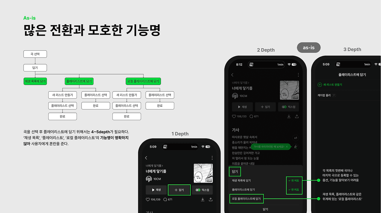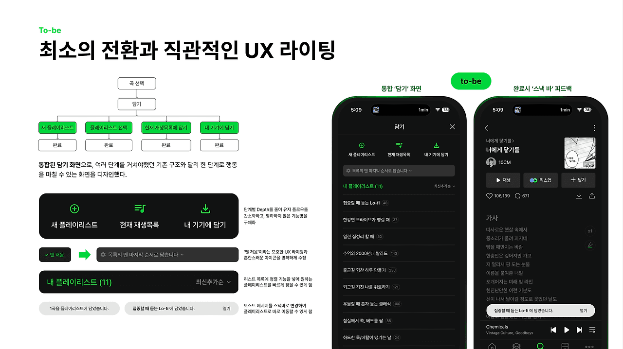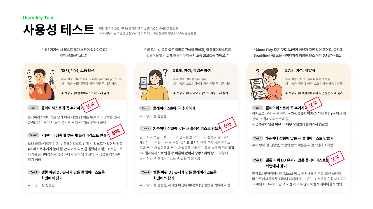 “멜론을 3년 이상 사용한 일반 리스너가 / 노래를 플레이리스트에 추가하려는 상황에서, / 일관성 없는 복잡한 과정으로 인해 불편함과 피로감을 겪고 있다.”