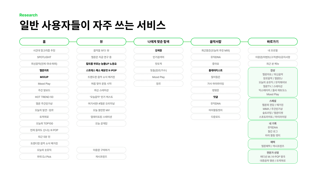 일반 사용자와 팬덤 사용자 모두 앱 사용 패턴은 달랐지만, 공통적으로 대부분의 기능을 잘 사용하지 않고, 새로 추가된 기능에 대해서도 인지하지 못하고 있었다. 멜론을 떠난 사용자들과 타 서비스 이용자들도 마찬가지였다. 행동은 달랐지만, 사용하는 기능은 전체 중 일부에 불과하다는 인식이 공통적으로 나타났다.