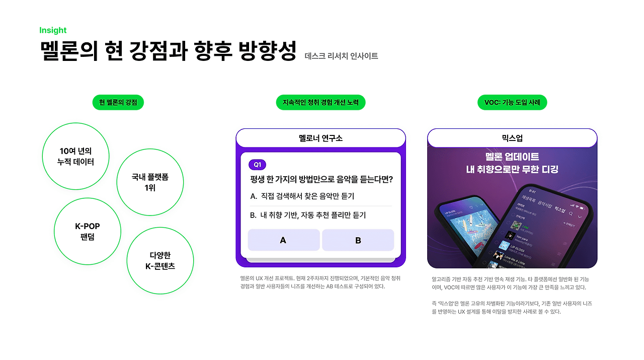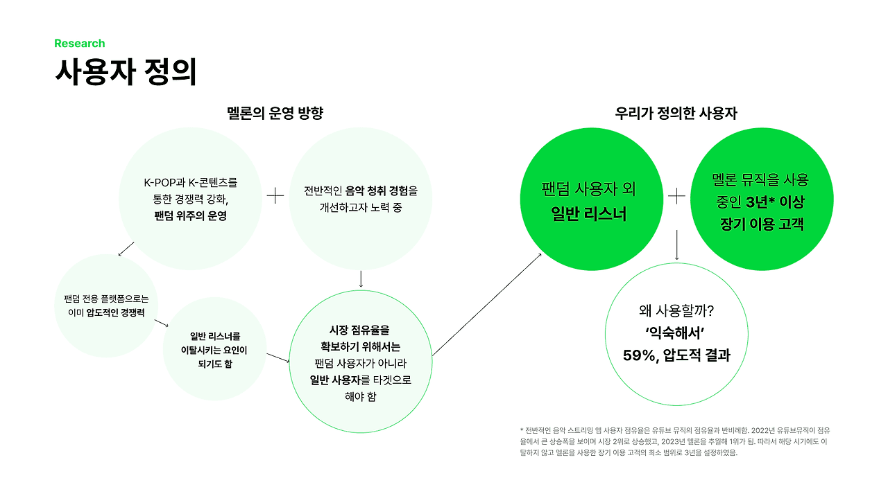 멜론은 팬덤 플랫폼으로는 이미 경쟁력이 충분하지만, 팬덤 위주의 사용 패턴은 일반 사용자들에게 오히려 불편 요소로 작용하기도 했다. 따라서 사용자 이탈을 방지하려면 일반 사용자들의 니즈를 반영해야 한다고 판단했다.