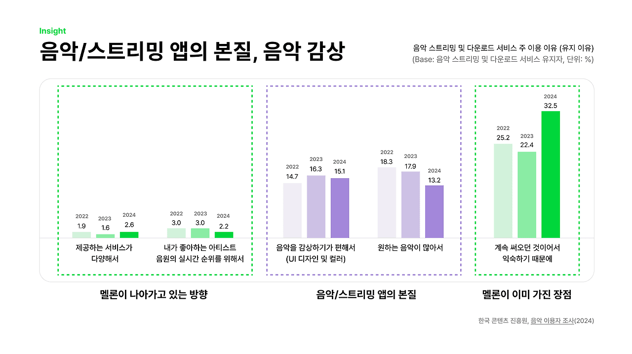 논문과 통계를 통해 조사한 결과, 서비스의 본질은 결국 ‘음악 감상’에 있다는 점을 확인했다.