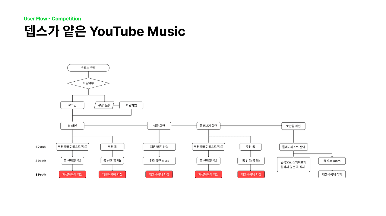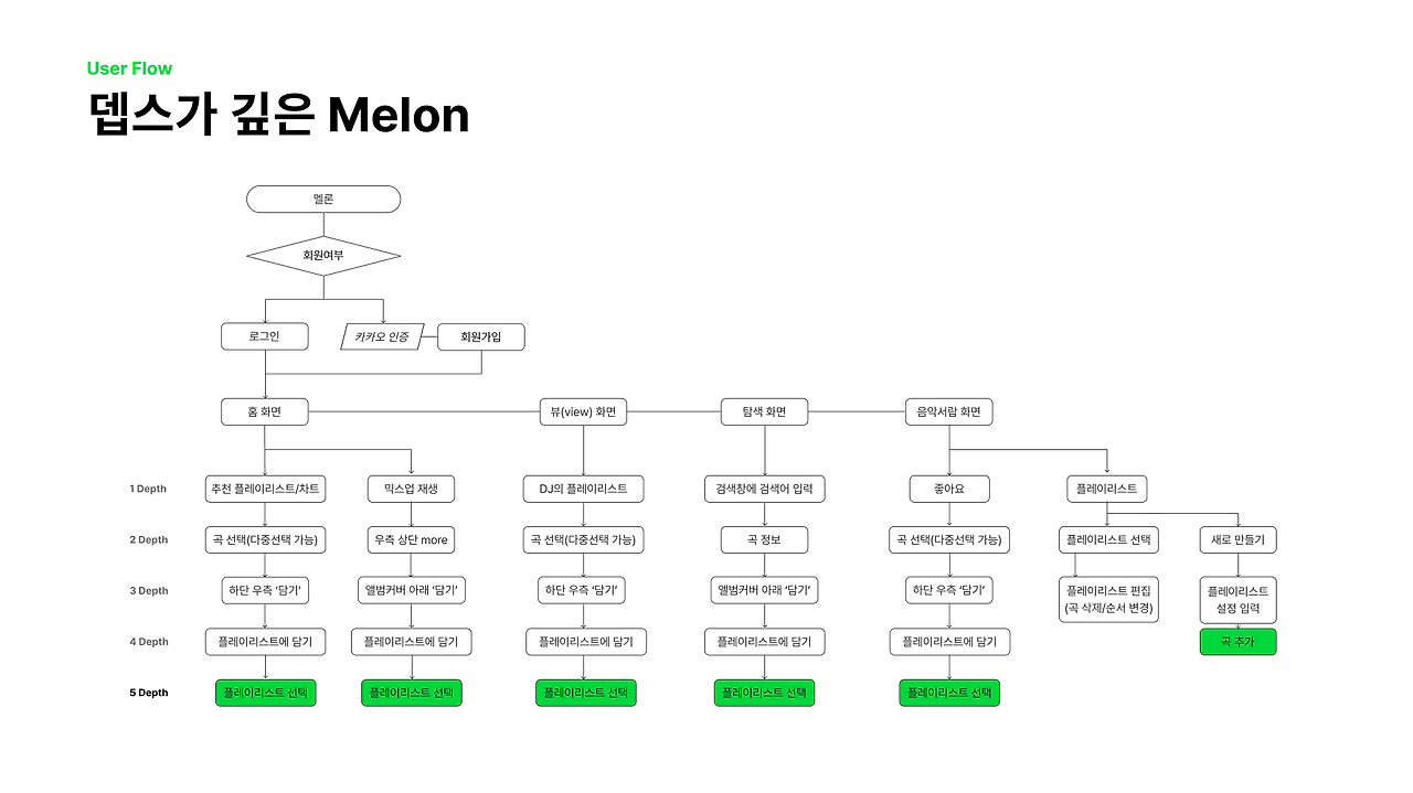 멜론은 플레이리스트까지 가는 데에 5단계 이상이 소요되는 반면, 경쟁사인 유튜브 뮤직은 3단계 이내로 접근이 가능했다.