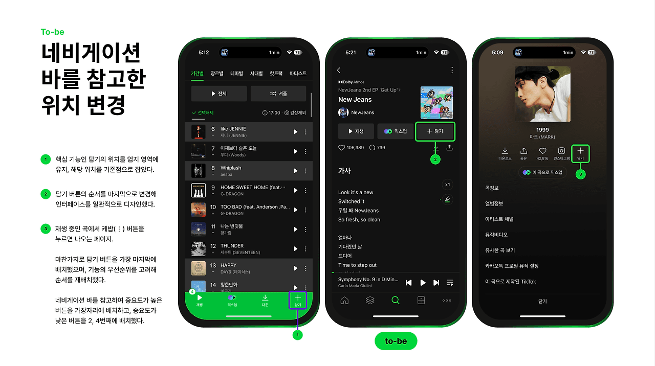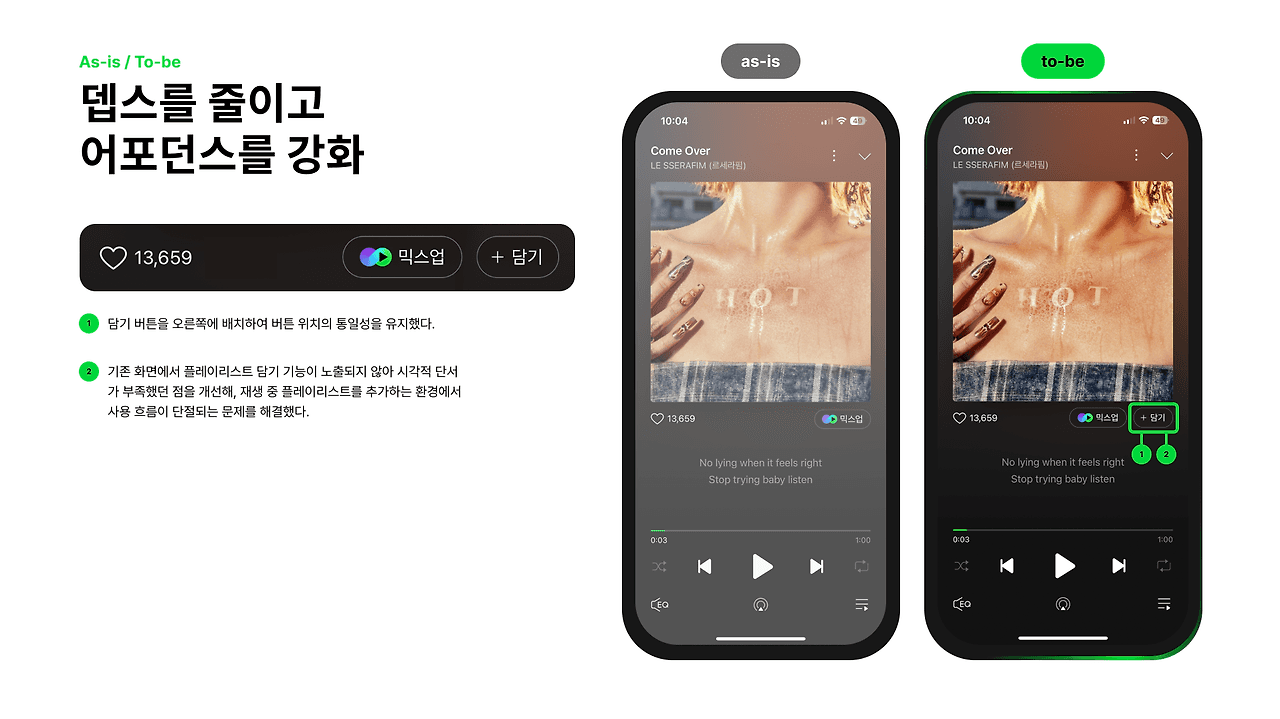 또한, 음악 재생 중에도 담기 버튼이 바로 보이도록 배치해 사용자의 청취 흐름이 끊기지 않도록 개선했다.