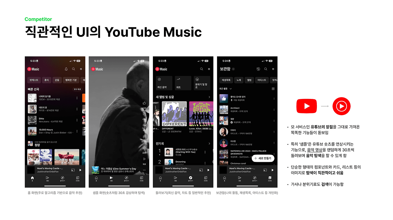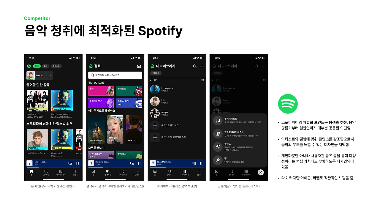 가장 강력한 경쟁 대상인 유튜브 뮤직과 급격하게 사용자가 늘어난 스포티파이를 분석했다. 양쪽 앱 모두 직관성이 높고 음악 청취라는 경험에 집중하고 있었다.