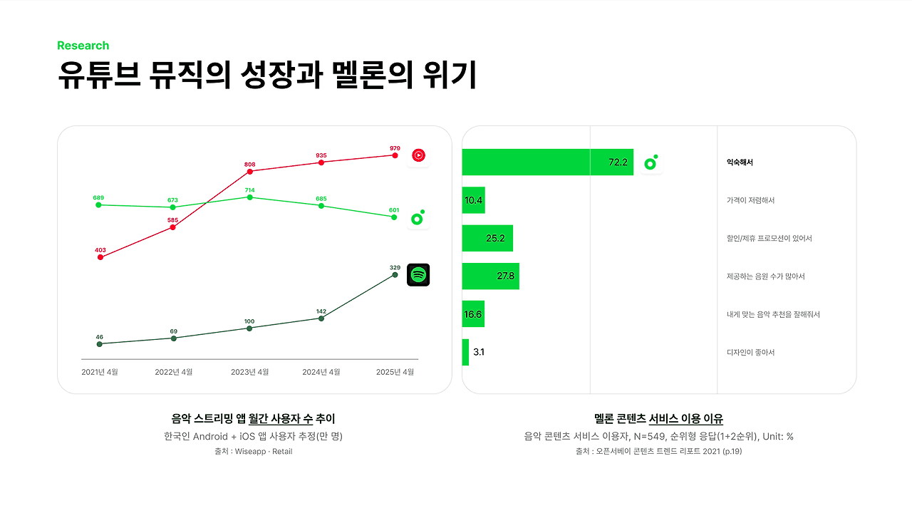 멜론은 국내 최대 음악 스트리밍 플랫폼으로, 높은 인지도와 시장 점유율을 보유하고 있다. 현재 글로벌 음악 스트리밍 시장은 빠르게 성장하고 있지만, 멜론은 유튜브 뮤직과 비교했을 때 사용자 수가 점차 감소하는 추세다.