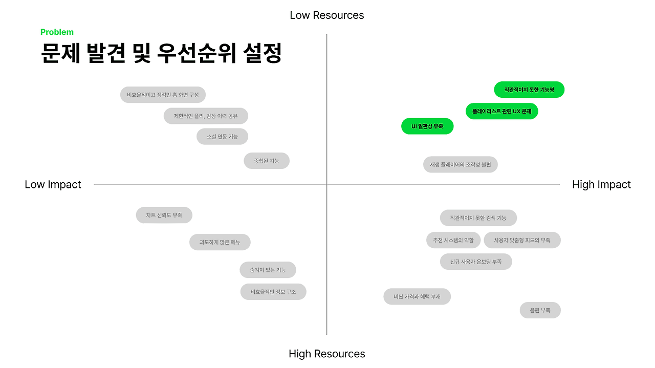 그 결과, 음악 청취 경험을 저해하면서도 적은 리소스로 개선 가능한 문제들을 선정할 수 있었다.