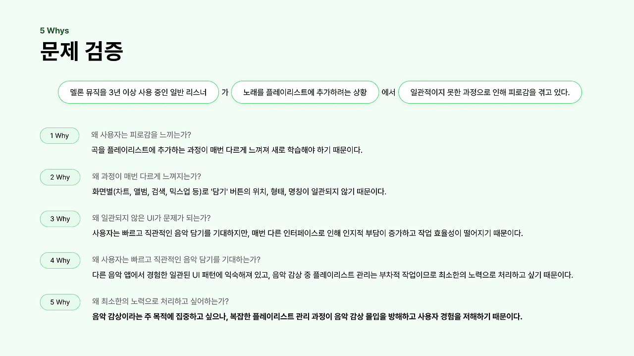 5 Whys 기법을 통해 문제의 본질을 다시 정리했다. 사용자는 ‘음악 감상’이라는 주 목적에 집중하고 싶지만, 복잡한 플레이리스트 관리가 몰입을 방해하고 있었다.